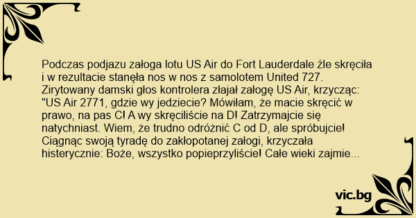 "US Air 2771, gdzie wy jedziecie? Mówiłam, że macie skręcić w prawo, na pas C! A wy skręciliście na D! Zatrzymajcie się natychniast. Wiem, że trudno odróżnić C od D, ale spróbujcie! Ciągnąc swoją tyradę do zakłopotanej załogi, krzyczała histerycznie: Boże, wszystko popieprzyliście! Całe wieki zajmie odkręcanie tego! Zostańcie, gdzie jesteście i nie ruszajcie się zanim nie powiem! Oczekujcie instrukcji do podjazdu za jakieś pół godziny; chcę żebyście jechali dokładnie gdzie wam wskażę, kiedy wskażę i jak wam wskażę! Zrozumieliście, US Air 2771? "Tak jest, proszę pani"