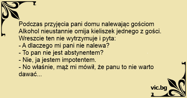 Alkohol nieustannie omija kieliszek jednego z gości. Wreszcie ten nie wytrzymuje i pyta: