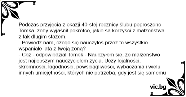 Podczas przyjęcia z okazji 40-stej rocznicy ślubu poproszono Tomka, żeby wyjaśnił pokrótce, jakie są korzyści z małżeństwa z tak długim stażem.