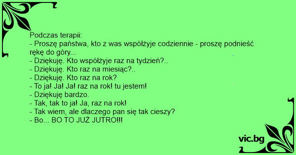Podczas terapii: - Proszę państwa, kto z was współżyje codziennie - proszę podnieść rękę do góry... - Dziękuję. Kto współżyje raz na tydzień?.. - Dziękuję. Kto raz na miesiąc?.. - Dziękuję. Kto raz na rok? - To ja! Ja! Ja! raz na rok! tu jestem! - Dziękuję bardzo. - Tak, tak to ja! Ja, raz na rok! - Tak wiem, ale dlaczego pan się tak cieszy? - Bo... BO TO JUŻ JUTRO!!!