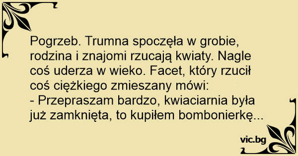 Pogrzeb. Trumna spoczęła w grobie, rodzina i znajomi rzucają kwiaty. Nagle coś uderza w wieko. Facet, który rzucił coś ciężkiego zmieszany mówi: