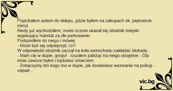- Zobaczymy kto kogo ma w dupie, jak dostaniesz wezwanie na policję - odparł strażnik.