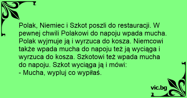 Polak, Niemiec i Szkot poszli do restauracji. W pewnej chwili Polakowi do napoju wpada mucha. Polak wyjmuje ją i wyrzuca do kosza. Niemcowi także wpada mucha do napoju też ją wyciąga i wyrzuca do kosza. Szkotowi też wpada mucha do napoju. Szkot wyciąga ją i mówi: