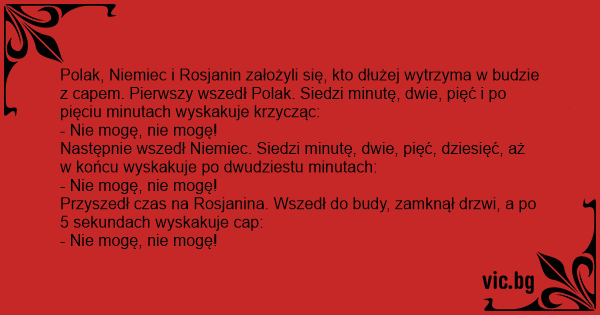 Polak, Niemiec i Rosjanin założyli się, kto dłużej wytrzyma w budzie z capem. Pierwszy wszedł Polak. Siedzi minutę, dwie, pięć i po pięciu minutach wyskakuje krzycząc: