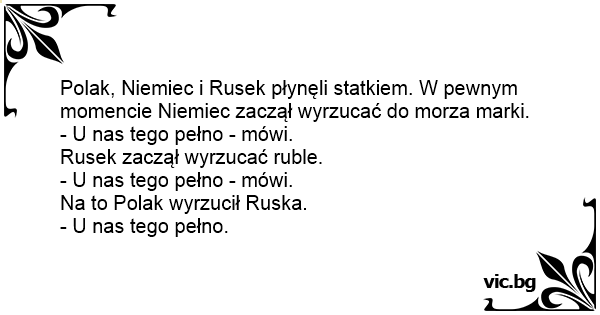 Polak, Niemiec i Rusek płynęli statkiem. W pewnym momencie Niemiec zaczął wyrzucać do morza marki.