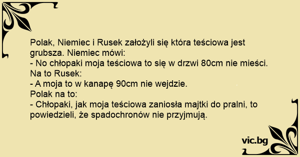 Polak, Niemiec i Rusek założyli się która teściowa jest grubsza. Niemiec mówi: