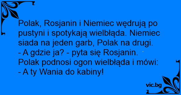 Polak, Rosjanin i Niemiec wędrują po pustyni i spotykają wielbłąda. Niemiec siada na jeden garb, Polak na drugi.