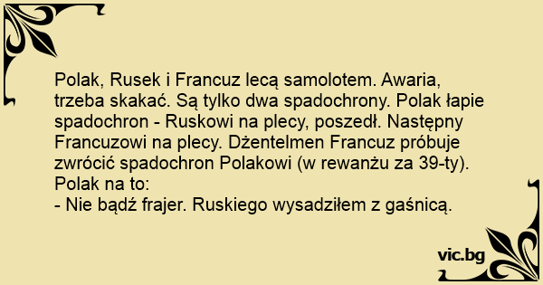 Polak, Rusek i Francuz lecą samolotem. Awaria, trzeba skakać. Są tylko dwa spadochrony. Polak łapie spadochron - Ruskowi na plecy, poszedł. Następny Francuzowi na plecy. Dżentelmen Francuz próbuje zwrócić spadochron Polakowi (w rewanżu za 39-ty). Polak na to: