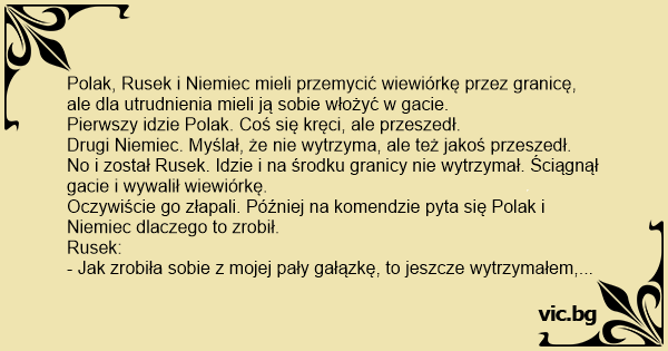 No i został Rusek. Idzie i na środku granicy nie wytrzymał. Ściągnął gacie i wywalił wiewiórkę.