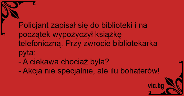 Policjant zapisał się do biblioteki i na początek wypożyczył książkę telefoniczną. Przy zwrocie bibliotekarka pyta: