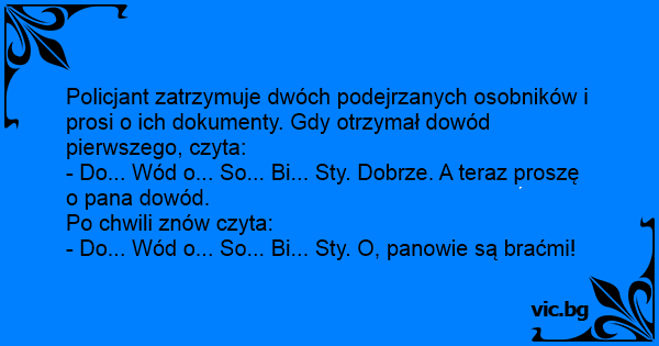 Policjant zatrzymuje dwóch podejrzanych osobników i prosi o ich dokumenty. Gdy otrzymał dowód pierwszego, czyta: