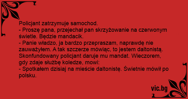 - Panie władzo, ja bardzo przepraszam, naprawdę nie zauważyłem. A tak szczerze mówiąc, to jestem daltonistą.