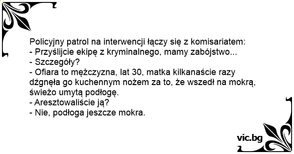- Ofiara to mężczyzna, lat 30, matka kilkanaście razy dźgnęła go kuchennym nożem za to, że wszedł na mokrą, świeżo umytą podłogę.