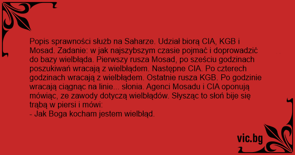 Popis sprawności służb na Saharze. Udział biorą CIA, KGB i Mosad. Zadanie: w jak najszybszym czasie pojmać i doprowadzić do bazy wielbłąda. Pierwszy rusza Mosad, po sześciu godzinach poszukiwań wracają z wielbłądem. Następne CIA. Po czterech godzinach wracają z wielbłądem. Ostatnie rusza KGB. Po godzinie wracają ciągnąc na linie... słonia. Agenci Mosadu i CIA oponują mówiąc, ze zawody dotyczą wielbłądów. Słysząc to słoń bije się trąbą w piersi i mówi:
