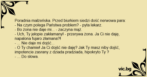- Uch, Ty jełopie zakłamany! - przerywa żona. Ja Ci nie daję, napalona fujaro złamana?!