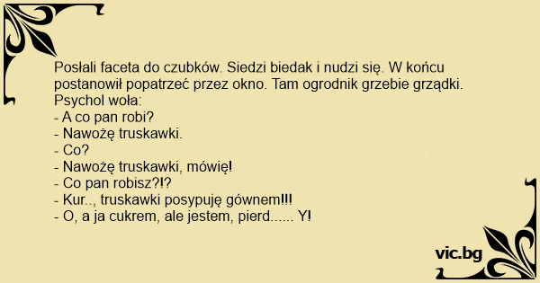 Posłali faceta do czubków. Siedzi biedak i nudzi się. W końcu postanowił popatrzeć przez okno. Tam ogrodnik grzebie grządki. Psychol woła: