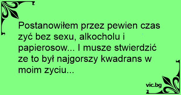 Postanowiłem przez pewien czas zyć bez sexu, alkocholu i papierosow... I musze stwierdzić ze to był najgorszy kwadrans w moim zyciu...