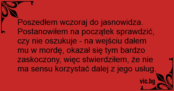 Poszedłem wczoraj do jasnowidza. Postanowiłem na początek sprawdzić, czy nie oszukuje - na wejściu dałem mu w mordę, okazał się tym bardzo zaskoczony, więc stwierdziłem, że nie ma sensu korzystać dalej z jego usług.