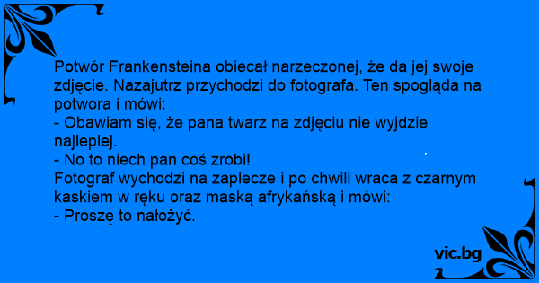 Potwór Frankensteina obiecał narzeczonej, że da jej swoje zdjęcie. Nazajutrz przychodzi do fotografa. Ten spogląda na potwora i mówi: