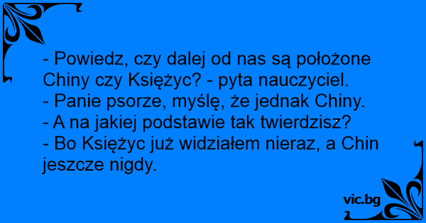 Што е подалеку Was ist weiter weg Το φεγγάρι ή η Καβάλα; Две блондинки седят и си говорят: Το φεγγάρι ή η Κίνα; Две блондинки си говорят: - Муцка, ти как мислиш, кое е по-близо - Лондон или Луната? Q. Which is closer, Florida or the moon? Duas amigas loiras conversam e uma pergunta para a outra: Deux blonds discutent. L'un d'elle dit : Unterhalten sich zwei Blondinen. "Sag mal, was ist eigentlich weiter weg: London oder der Mond?",- "Hallooooo? Hör ma! Kannst du London von hier aus sehen?" Two blondes are sitting on a bench at the park. One says to the other,"Hey, which is farther, California or the moon?" The other blonde says,"Well, duh! Can you see California?" Frida, vad ligger längst bort? Frankrike eller månen? - Frankrike! - Men Frida! Hur kan du tro det? - Jag kan ju se till månen men inte till Frankrike... So I asked a blonde, "Which is closer, Florida or the Sun?" She said, "The Sun, because I can look up and see it. TEACHER : What is further away, Australia or the Moon? Pupil : Australia, you can see the Moon at night. Det var två blondiner som satt på en kulle och filosoferade. Då sa den ena: - Vilket tror du är kortast? Till månen eller Malmö? - Dööö...?! Månen såklart! Ser du Malmö eller? Två blondiner sitter på ett berg i Örebro, när den ene plötsligt frågar: - Vilket är närmast, Borås eller månen? - Meen daaaaa! Ser du Borås härifrån eller? Två blondiner sitter på en bänk och filosoferar. Den ena frågar sin kompis: - Vilket ligger närmast oss, månen eller Borås? Kompisen svarar: - Mohahaha! Vadå, ser du Borås, eller?! Den ene blondine spørg den anden, blondine om hvad der ligger længst væk, London eller månen. Den anden blondine svarer, er du dum eller hvad, kan du måske se London her fra? Kumpi on kauempana, Ranska vai Kuu? Ranska. Miksi niin luulet? Koska voin nähdä Kuun, mutta en näe Ranskaa. - Hva er egentlig nærmest: månen eller Afrika? - Å din tullebukk! Det er selfølgelig månen. Afrika kan man jo ikke se herfra. To blondiner snakket sammen i Oslo. Den ene spurte den andre: – Hva er nærmest? Bergen eller månen? – Månen selfølgelig! Kan du se Bergen, kanskje? Deux mec bourré discutent en fumant leurs cigarettes devant un bar : - A ton avis, qu'est-ce qui est plus proche de nous, la lune ou l’Amérique ? - Ben la lune, mec ! - Tu es sure ? - Ben ouai,... Pepíček u tabule. „Pověz mi, co je dál - Měsíc nebo Čína?” „Čína.” „A proč?” „Měsíc vidím každý den, ale Čínu jsem ještě neviděl!” Le pregunta una rubia a otra: - ¿Qué queda más lejos, Brasil o la luna? - ¡Ay tontaaaa! ¿Acaso podés ver Brasil desde aquí? Det var två blondiner som satt på en bänk i Trollhättan och diskuterade, när den ena frågade: - Vart är det längst, till Månen eller Borås? Då svarade den andra: - Men hallååååååååå, ser du Borås... Estaban dos chavas fresas y una le dice a la otra: - Oye, ¿que esta mas cerca la luna o londres? Y le contesta: - Ay! no seas ****a apoco desde aqui ves londres! Eran 2 rubias y una le pregunta a la otra Oye q queda mas lejos londres o la luna Y la otra responde tu si q eres bruta acaso ves londres Öğretmen emine'ye sorar: - Söyle bakalim yavrum,hindistan mi daha uzaktir yoksa ay mi? - Hindistan daha uzaktir hocam. - Nasil olur kizim? - Öğretmenim,bazi geceler ay'i görebiliyoruz,ama... 2 blondiner sidder og snakker... 2 blondiner sidder og snakker og pludseligt siger den ene: - Hvor er der længest til - månen eller London? Så svarer den anden med et grin: - Doorh, kan du måske se... Blondinen Der var en blondine og mand. Blodinen spørger manden hvad der ligger tættets på, London eller månen? Manden siger London og blondinen siger: - Hallo kan du se London herfra? Двете плавуши сериозно разговараат: Па, мила, што мислиш што е поблиски Месечината или Лондон? Еј што си глупа, па можеш ли да го видиш Лондон од тука? Μια ξανθιά αναρωτιέται τι είναι πιο κοντά, το Λονδίνο ή το φεγγάρι και ρωτά μια φίλη της. Αυτή της απαντά: - Helooooo!Το Λονδίνο το βλέπεις από εδώ? In Erdkunde prüft die Lehrerin ihre Schulklasse auf Herz und Nieren: "Was ist näher: Der Mond oder China?" Christoph in der ersten Bank meint: "Ich glaub, der Mond ist näher. Denn den sehe...