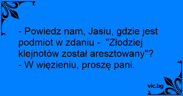 - Powiedz nam, Jasiu, gdzie jest podmiot w zdaniu - "Złodziej klejnotów został aresztowany"?