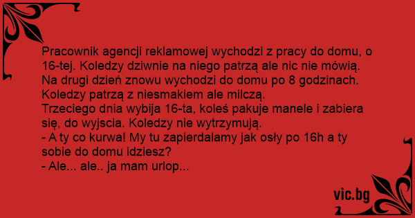 - A ty co kurwa! My tu zapierdalamy jak osły po 16h a ty sobie do domu idziesz?