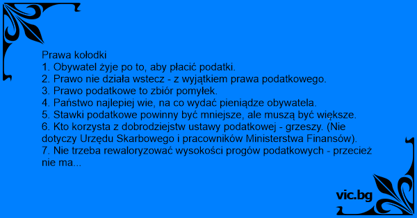 Prawa kołodki 1. Obywatel żyje po to, aby płacić podatki. 2. Prawo nie działa wstecz - z wyjątkiem prawa podatkowego. 3. Prawo podatkowe to zbiór pomyłek. 4. Państwo najlepiej wie, na co wydać pieniądze obywatela. 5. Stawki podatkowe powinny być mniejsze, ale muszą być większe. 6. Kto korzysta z dobrodziejstw ustawy podatkowej - grzeszy. (Nie dotyczy Urzędu Skarbowego i pracowników Ministerstwa Finansów). 7. Nie trzeba rewaloryzować wysokości progów podatkowych - przecież nie ma inflacji. 8. Przekazuj darowizny tylko najbardziej potrzebującym: pracownikom Urzędów Skarbowych. 9. Pakiet "Polska 2000" jest dobry, przez co niemożliwy do realizacji. 10. W roku 2001 znieść całkowicie podatek dochodowy, wprowadzając w to miejsce VAT w wysokości 200 procent.