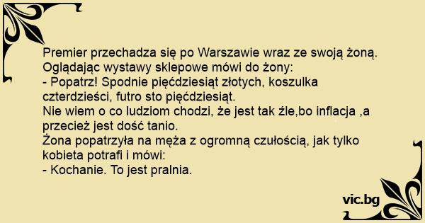Premier przechadza się po Warszawie wraz ze swoją żoną. Oglądając wystawy sklepowe mówi do żony:
