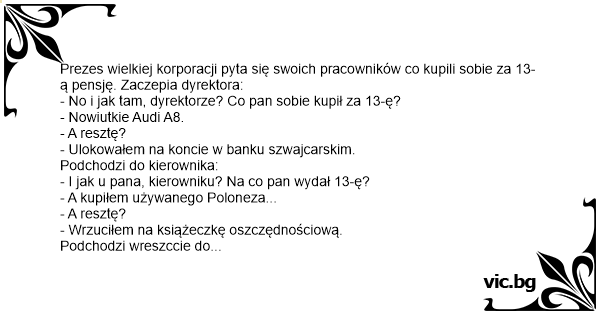 Prezes wielkiej korporacji pyta się swoich pracowników co kupili sobie za 13-ą pensję. Zaczepia dyrektora: