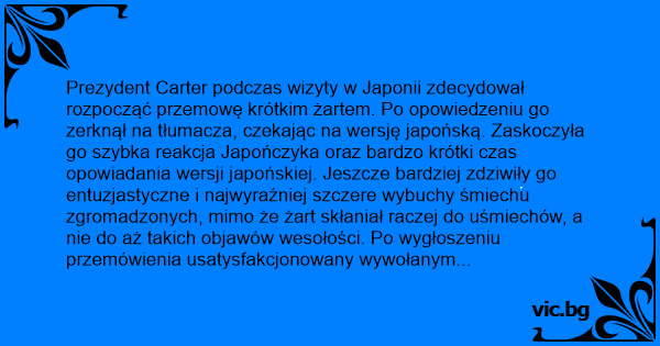 Prezydent Carter podczas wizyty w Japonii zdecydował rozpocząć przemowę krótkim żartem. Po opowiedzeniu go zerknął na tłumacza, czekając na wersję japońską. Zaskoczyła go szybka reakcja Japończyka oraz bardzo krótki czas opowiadania wersji japońskiej. Jeszcze bardziej zdziwiły go entuzjastyczne i najwyraźniej szczere wybuchy śmiechu zgromadzonych, mimo że żart skłaniał raczej do uśmiechów, a nie do aż takich objawów wesołości. Po wygłoszeniu przemówienia usatysfakcjonowany wywołanym wrażeniem, zapytał tłumacza, czy żart przekazany był uczestnikom spotkania w jakiś specjalny sposób - może reakcja zależała od sposobu opowiadania. Japończyk odparł: