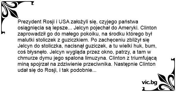 Prezydent Rosji i USA założyli się, czyjego państwa osiągnięcia są lepsze... Jelcyn pojechał do Ameryki. Clinton zaprowadził go do małego pokoiku, na środku którego był malutki stoliczek z guziczkiem. Po zachęceniu zbliżył się Jelcyn do stoliczka, nacisnął guziczek, a tu wielki huk, вuм, coś błysnęło. Jelcyn wygląda przez okno, patrzy, a tam w chmurze dymu jego spalona limuzyna. Clinton z triumfującą miną spojrzał na zdziwienie przeciwnika. Następnie Clinton udał się do Rosji, i tak podobnie jak poprzednio znaleźli się w małym pokoiku, na środku którego był malutki stoliczek z guziczkiem. Po zachęceniu zbliżył się Clinton do stoliczka, nacisnął guziczek, a tu nic... Następnie z ironicznym uśmiechem powiedział: