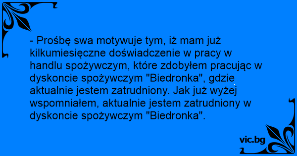 - Prośbę swa motywuje tym, iż mam już kilkumiesięczne doświadczenie w pracy w handlu spożywczym, które zdobyłem pracując w dyskoncie spożywczym "Biedronka", gdzie aktualnie jestem zatrudniony. Jak już wyżej wspomniałem, aktualnie jestem zatrudniony w dyskoncie spożywczym "Biedronka".