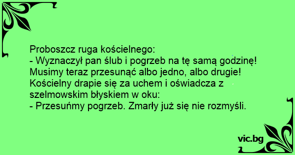 - Wyznaczył pan ślub i pogrzeb na tę samą godzinę! Musimy teraz przesunąć albo jedno, albo drugie!