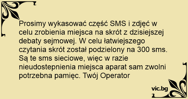 Prosimy wykasować część SMS i zdjęć w celu zrobienia miejsca na skrót z dzisiejszej debaty sejmowej. W celu łatwiejszego czytania skrót został podzielony na 300 sms. Są te sms sieciowe, więc w razie nieudostepnienia miejsca aparat sam zwolni potrzebna pamięc. Twój Operator