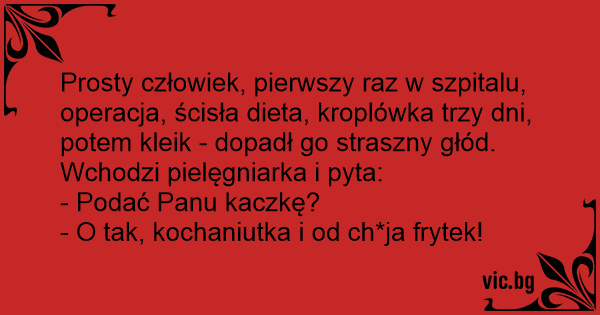 Prosty człowiek, pierwszy raz w szpitalu, operacja, ścisła dieta, kroplówka trzy dni, potem kleik - dopadł go straszny głód.