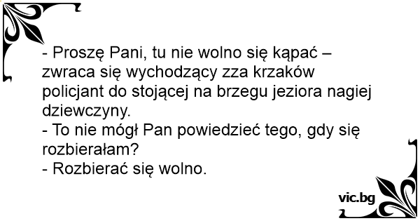 - Proszę Pani, tu nie wolno się kąpać – zwraca się wychodzący zza krzaków policjant do stojącej na brzegu jeziora nagiej dziewczyny.
