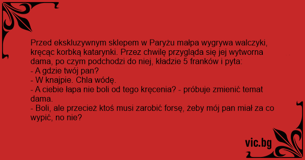 - Boli, ale przecież ktoś musi zarobić forsę, żeby mój pan miał za co wypić, no nie?