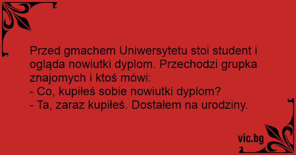 Przed gmachem Uniwersytetu stoi student i ogląda nowiutki dyplom. Przechodzi grupka znajomych i ktoś mówi: