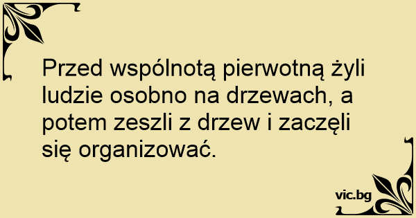 Przed wspólnotą pierwotną żyli ludzie osobno na drzewach, a potem zeszli z drzew i zaczęli się organizować.