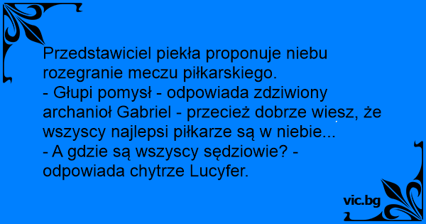 - Głupi pomysł - odpowiada zdziwiony archanioł Gabriel - przecież dobrze wiesz, że wszyscy najlepsi piłkarze są w niebie...