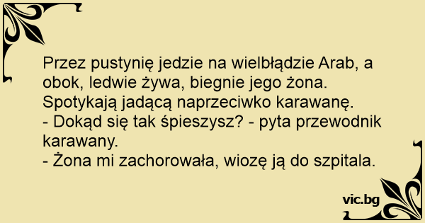 Przez pustynię jedzie na wielbłądzie Arab, a obok, ledwie żywa, biegnie jego żona. Spotykają jadącą naprzeciwko karawanę.