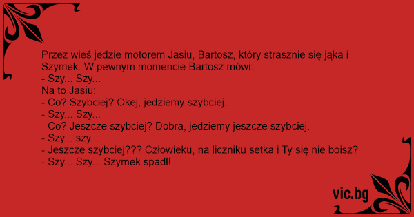 Przez wieś jedzie motorem Jasiu, Bartosz, który strasznie się jąka i Szymek. W pewnym momencie Bartosz mówi: