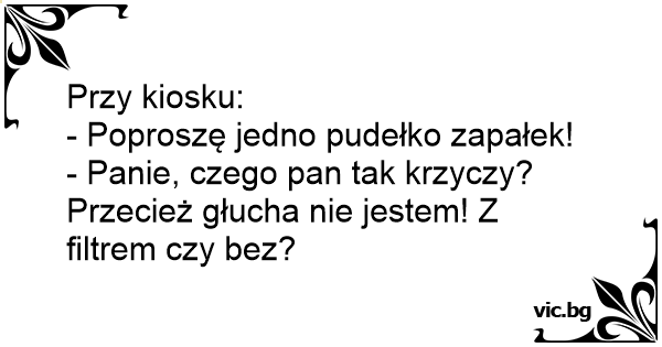 - Panie, czego pan tak krzyczy? Przecież głucha nie jestem! Z filtrem czy bez?
