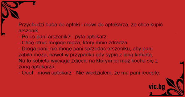 Jedna gospođa dođe u ljekarnu i traži arsenik. Ljekarnik: - "Budući se radi o jakom otrovu, moram vas pita za što vam je potreban?" - "Želim otrovati moga muža." - "Žao mi je, ali u tom slučaju vam...