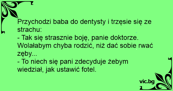 Was ist schmerzvoller Η ιδιαίτερη...προτίμηση Ακόμη 3 Ιατρικά Момиче казва на зъболекаря: - Леле докторе, многу ми е страв од заболекар! Подобро да родам уште едно дете! - Зубы у Вас плохие, предстоит много работы. Στο οδοντοιατρείο, η ασθενής: Eine Frau beim Zahnarzt: "Ich weiß nicht, was schlimmer ist: an den Zähnen gebohrt zu werden, oder ein Kind zu bekommen." Der Arzt: "Sie müssen sich entscheiden, damit ich den Stuhl entsprechend einstellen kann..." Une femme qui arrive chez le dentiste dit à son assistante: - Je viens pour me faire retirer une dent. Alors l'assistante lui répond: - Eh bien, vous en avez du courage! Et la patiente répond: - Oh... A madame vai ao dentista, e diz: — Ai doutor, eu tenho mais medo de arrancar um dente do que ter um filho! Ao que o dentista diz: — Decida-se logo, para que eu ajeite a posição da cadeira. Una mujer va al dentista a regañadientes, y cuando el doctor le dice que va a tener que empastarle una muela, la mujer se niega a abrir la boca, así que el dentista la dice: - Pero bueno, ¿y para... La señora llega al dentista y dice: - ¡Ay, qué miedo tengo, doctor!. Creo que casi preferiría tener un hijo antes que sacarme la muela. - Bueno mujer, pues dígame usted por cual de las dos cosas se... En tiedä, kumpi on kamalampaa, hampaan poisto vai lapsen teko, huokaisi nainen hammaslääkärille. - Päättäkää nopeasti, jotta tiedän, mihin asentoon säädän tuolin. Przychodzi baba do dentysty: - Panie doktorze, tak strasznie boje się borowania, że chyba wołałabym już zajść w ciąże. - To niech się pani zdecyduje, bo nie wiem, jak fotel mam ustawić. - Doktor úr, rettenetesen félek a foghúzástól. Esküszöm inkább szülnék még egy gyereket. - Döntse el asszonyom, mert akkor úgy állítom a széket... Un gars souffre terriblement de ses dents depuis trois jours. Mais comme il a très peur du dentiste, il refuse d'y aller. N'en pouvant plus de l'entendre hurler, sa femme appelle ses 2 frères et... Fogorvosnál egy gyönyörű nő hangosan morfondírozik: - Mi lehet fájdalmasabb, kihúzatni egy fogat, vagy szülni egy gyereket? Mire a fogorvos: - Kérem kisasszony, gondolja meg gyorsan, mert nem... Diş hekiminin odasına giren genç ve güzel kadın : - Ah doktorcuğum, dedi. Bu dişi çektirmektense, çocuk doğurmayı tercih Ederim. Doktor : - Öyleyse koltuğun ayarını yapmadan önce kararınızı verin "Oh, tandarts, ik krijg nog liever een kind. " "Dat kan ook maar dan moet de stoel even anders."