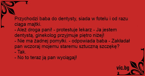 Dentist Μασέλα Бабичка отива на зъболекар. Ляга на стола и си вдига краката. Една баба отива на зъболекар. Сяда на стола и се разкрачва. An old lady went to visit her dentist. When it was her turn, she sat in the chair, lowered her underpants, and raised her legs. The dentist said: “Excuse me, but I’m not a gynecologist.” “I know,” said the old lady. “I want you to take my husband’s teeth out.” En äldre dam kom in till tandläkaren, drog av sig trosorna, och hoppade upp i tandläkarstolen med benen isär. Tandläkaren blev pinsamt röd, men tog det med fattning. - Nu har du allt kommit fel,... Aquela senhora, sempre muito discreta, entra no consultório do dentista, levanta a saia, tira a calcinha e senta-se na cadeira com as pernas escancaradas. Indignado, o dentista consegue balbuciar:... To takhle přišla do zubní ordinace pěkná ženská, posadila se do křesla, vyhrnula sukni, sundala kalhotky a roznožila. Lékař ji jemně upozornil, že je u zubaře a ne u gynekologa. Načež odvětila:... Una mujer acude al dentista. Cuando llega su turno, se baja la falda, se baja las bragas, y se sienta en la silla, con las piernas abiertas. El dentista al entrar en la sala, se queda sorprendido y... Una donna va da stomatologa, si sdraia sulla sedia come dal ginecologo e il dottore: - "Signora, lei ha sbagliato il gabinetto... Non sono medico ginecologo!!! - "So benissimo dottore! ma solo lei...