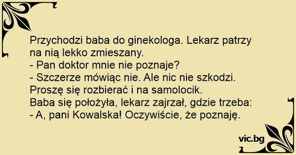Przychodzi baba do ginekologa. Lekarz patrzy na nią lekko zmieszany.
