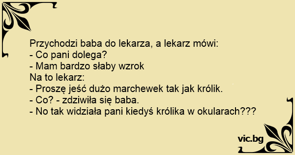 Medicul oftalmolog o sfatuieste pe o pacienta sa faca o Cura de morcovi pentru a-si imbunatati vederea. Sceptica, femeia intreaba: - Domnule doctor, sinteti sigur ca nu voi mai avea Probleme cu...