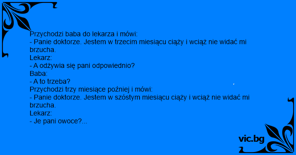 - Panie doktorze. Jestem w trzecim miesiącu ciąży i wciąż nie widać mi brzucha.