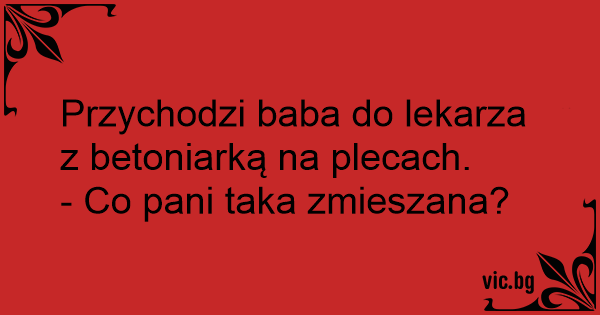 Przychodzi baba do lekarza z betoniarką na plecach.